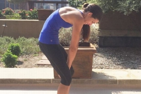 1.站起來,然後彎曲你的膝蓋一點,向前傾斜,用你的雙手握住你的大腿內側。