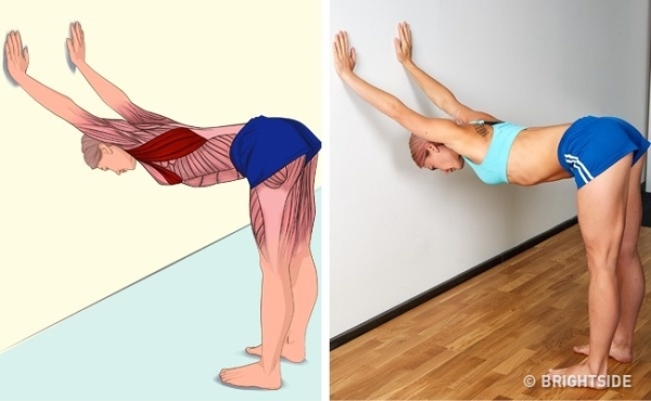 ▼胸肌和背闊肌: 背對牆壁,一隻手慢慢放到牆壁上。