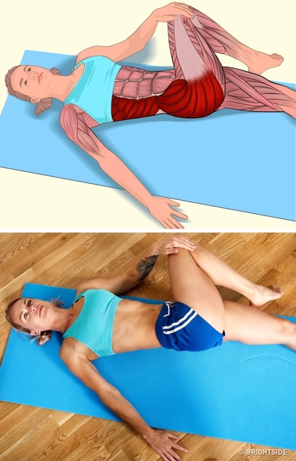 ▼臀大肌和腹外斜肌: 仰躺在地,彎曲右膝,
