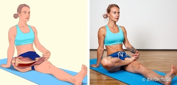 兩腳相對,盡量下壓膝蓋。
