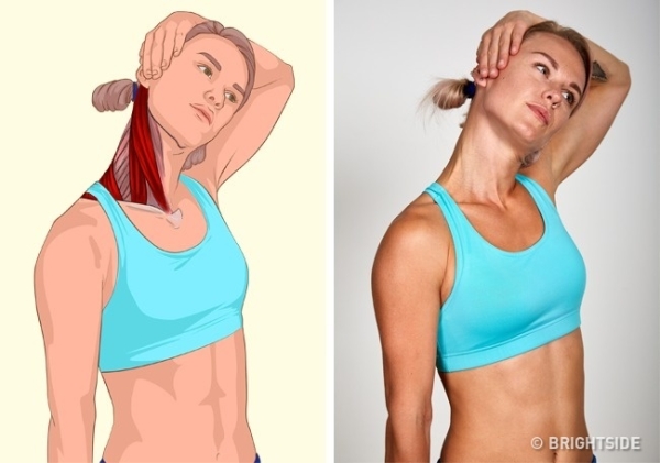 慢慢向左歪頭,試著用左耳碰左肩。
